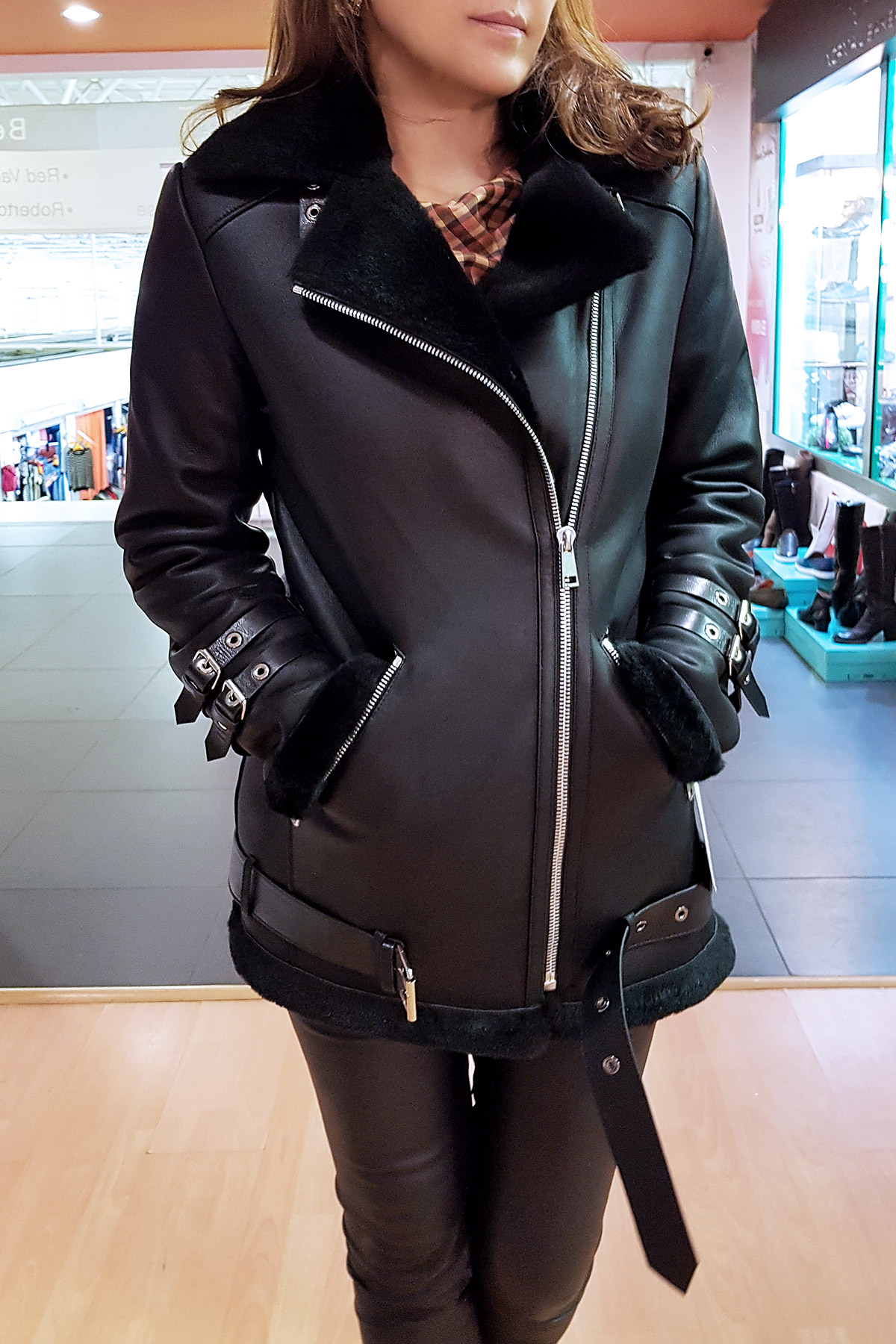 - Чтобы подчеркнуть приличия черной кожаной куртки Claris Women’s Sheepskin Black Leather Jacket, наденьте ее поверх белой шелковой блузки и светло-розовой юбки-карандаш