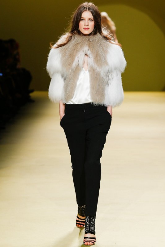 Начальный образ задал тон, напоминая о славных годах Лагерфельда в начале 70-х, когда он впервые заявил о себе в качестве дизайнера Chloé и Fendi — от парика в виде чашки для пудинга в стиле ABBA до туфель на каблуках из горного хрусталя. Показ открылся стройным белым костюмом из валяной шерсти с жакетом с длинными рукавами и широкими брюками-голенищами. Под настроение этого периода были макси-пальто с меховыми полосками, выполненными в разных направлениях или состриженными для создания узоров в стиле деко в других фирменных изобретениях Лагерфельда. Каждое пальто было двусторонним, и один пример — развязный, обтягивающий щиколотку плащ из фая на подкладке из темнейшего соболя (с массивным медальоном и позицией) — отдавал дань уважения костюму Fendi Сильваны Мангано для культового 19-летия Лукино Висконти.