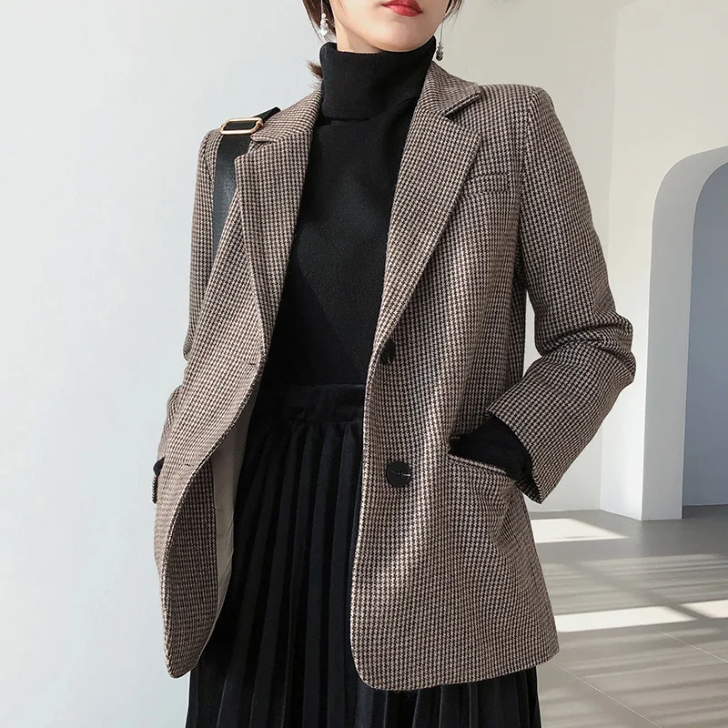 На последний пункт стоит обратить особое внимание, ведь клетка на пике популярности этой осенью, и если вы выберете бежевый, светло-коричневый, синий или серый женский пиджак в клетку, вы точно не прогадаете.