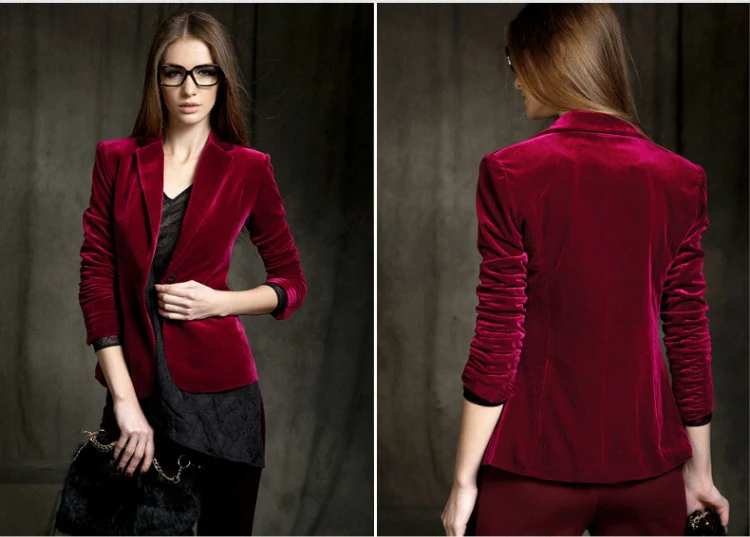 Черный, изумрудный и бордовый велюр в пиджаках приталенных двубортных и удлиненных фасонов, допускается носить на нижнее белье и без юбки или брюк, как свободное и короткое платье. Образ для смелых молодых леди с отличной фигурой. Такие элементы, как чокер, длинные серьги и обувь на шпильке дополнят стиль.