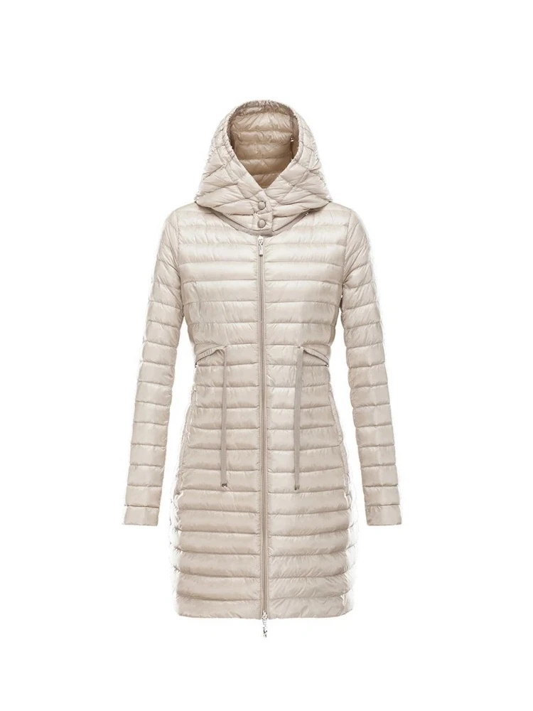 Эта легкая куртка оснащена двусторонней молнией спереди и четырьмя практичными карманами. Он также имеет толстовку с прикрепленными теплыми воротниками и мягкими чашками с отверстиями для больших пальцев, чтобы держать руки в тепле. Эта куртка наполнена 90% белого утиного пуха, согревающего тело и защищающего от холодного ветра.