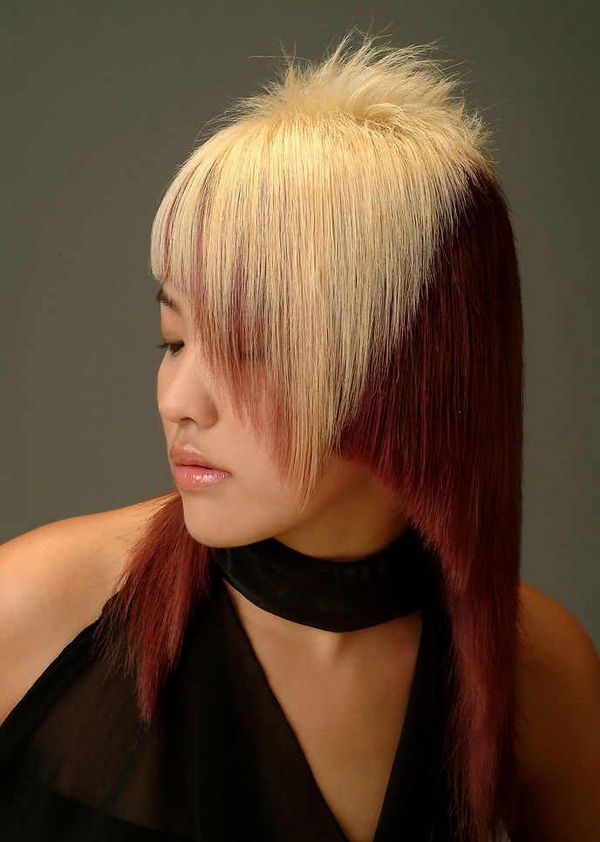 Челка в креативной стрижке также играет не последнюю роль. Полностью прямая, треугольная, длинная, короткая. Можно экспериментировать по-разному, изящные черты лица позволяют. Очень модно смотрятся в креативных прическах открытые уши. Иногда открывают одно, иногда сразу два уха. Асимметрия подчеркивается креативным окрашиванием в яркие цвета.