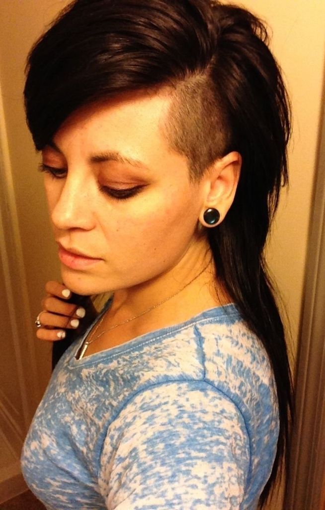 Стрижка с выбритыми виском и затылком не имеет особых ограничений на длину локонов. Вкупе с короткими волосами, она будет смотреться особенно дерзко. А длинные волосы не смогут полностью перекрыть выбритую часть, оставляя за собой долю загадочности.