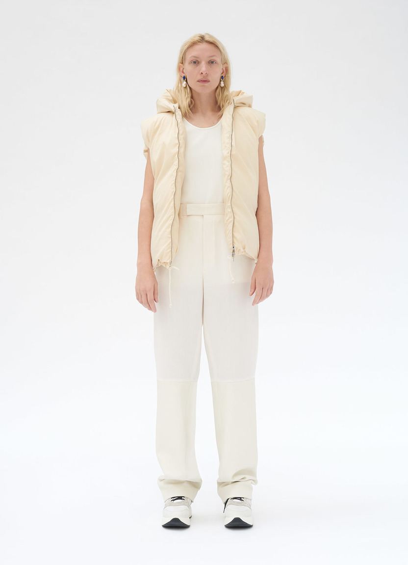 Отлично, тогда давайте строить образ на контрасте: белые брюки сочетаем с черным или серым жилетом. Не переживайте, длинный жилет не «затмит» собой светлую одежду, а наоборот, подчеркнет ваш смелый выбор.