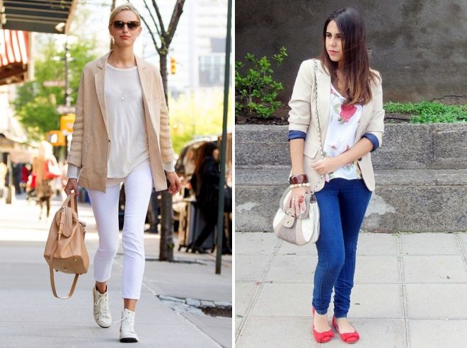 Наденьте бежевый пиджак с джинсами и футболкой, и получите прекрасный образ на каждый день. Замените футболку на рубашку – и готов деловой образ для офиса. Как и в случае с шортами, обувь можно подобрать в спортивном стиле, на плоской подошве или на каблуке.