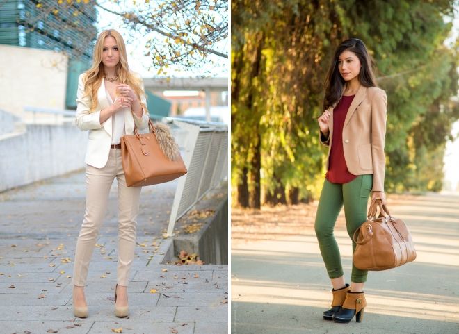 При выборе того, с чем носить бежевый пиджак женщинам, важно предусмотреть все нюансы и подобрать не только подходящие предметы гардероба, но и аксессуары. Так, ни одна современная модница не обходится без сумочки, которая предназначается для переноски необходимых мелочей и при этом является очень важным элементом образа. Лучше всего к этому изделию подойдут хранилища следующих цветовых оттенков: