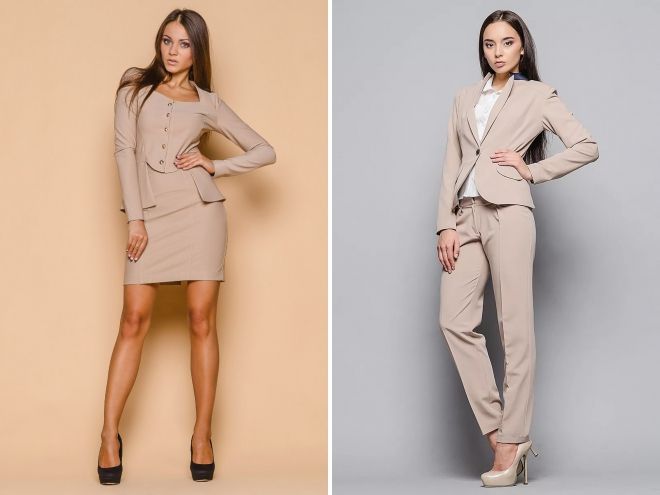 - Классический вариант, подходящий для офисных будней, деловых встреч, получится, если комбинировать жакет бежевого цвета с брюками строгого покроя, юбкой-карандаш.
