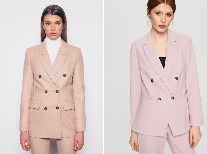 Классическая двубортная модель отличается от однобортной наличием двух вертикальных рядов пуговиц, которые располагаются по обе стороны от центральной планки. В большинстве случаев на таких моделях нашиваются средние по размеру пуговицы в тон, однако, очень интересно смотрятся варианты с контрастными пуговицами. Так, например, темно-бежевый пиджак будет отлично смотреться с синими или белыми пуговицами, а светло-бежевый можно декорировать оригинальными круглыми пуговицами цвета фуксия.
