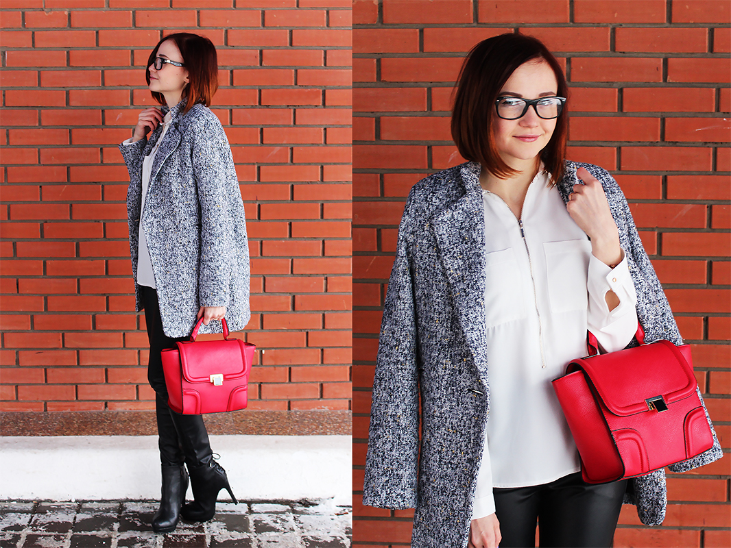 В качестве обуви мы рекомендуем выбрать черные ботильоны на высоком, но устойчивом каблуке. Если ваша работа связана так или иначе с творчеством или позволяет некоторые вольности в образе, то смело выбирайте сумку яркого оттенка. Со спокойной, но стильной бело-серо-черной гаммой даже такая яркая деталь, как красная сумка, будет смотреться органично.